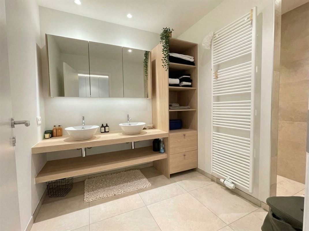 Badkamer 10m², inloop regendouche, 2 lavabo’s, op maat gemaakt badkamermeubel met open linnenschabben afgewerkt in hout, spiegelkast, handdoekdroger.