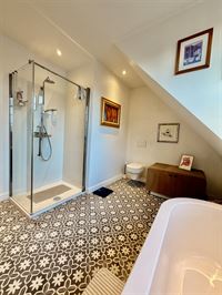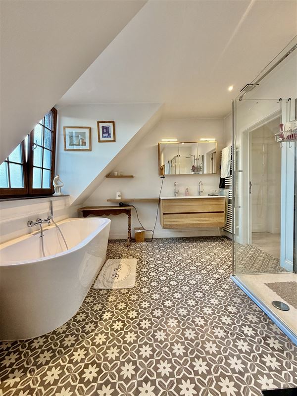 Badkamer 11m² op ker. siertegel, met dubbele lavabo, toilet, handoekdroger (elek.) Ligbad en Regendouche.