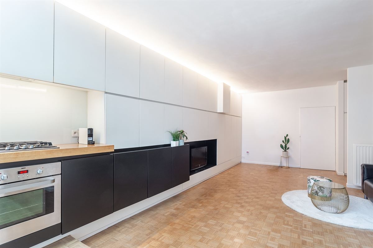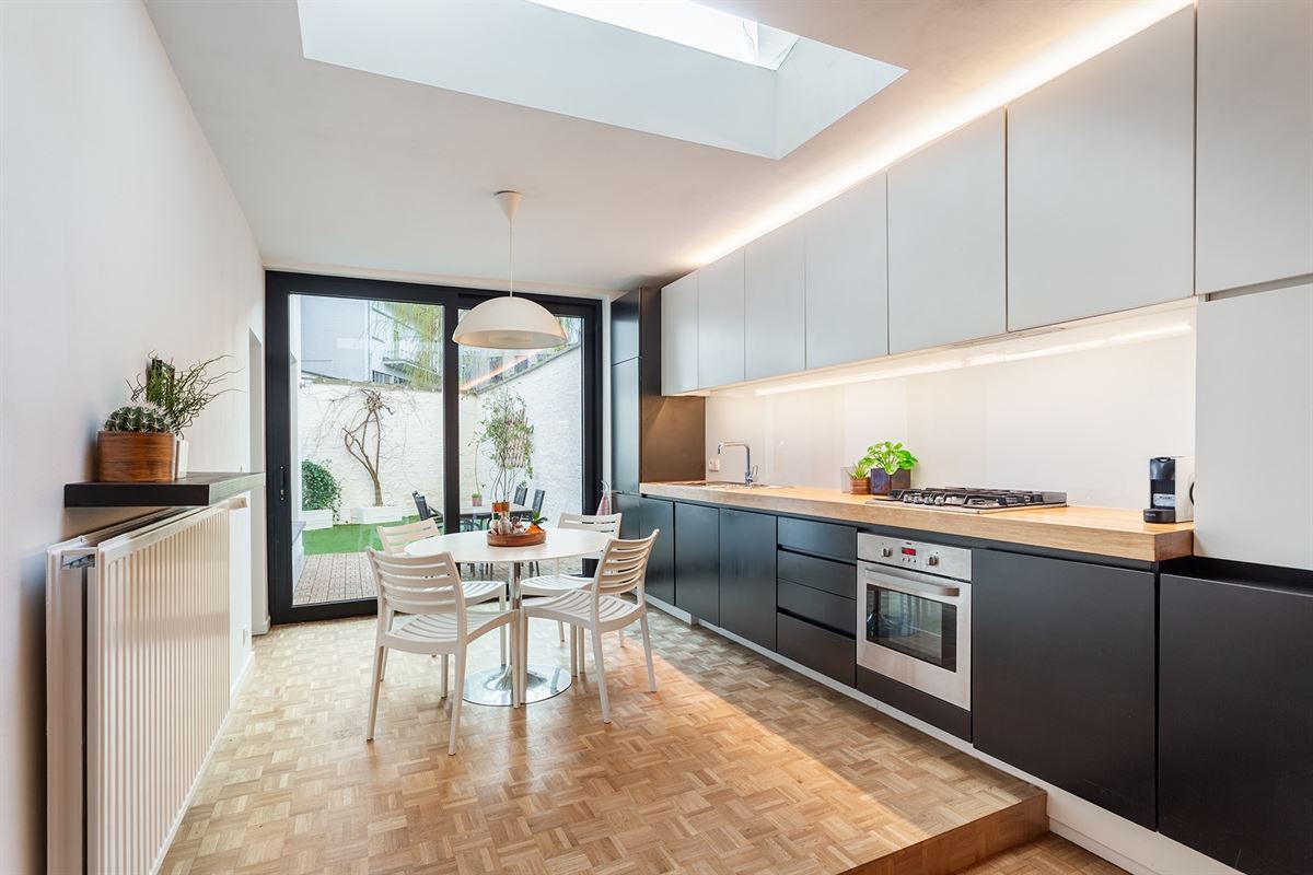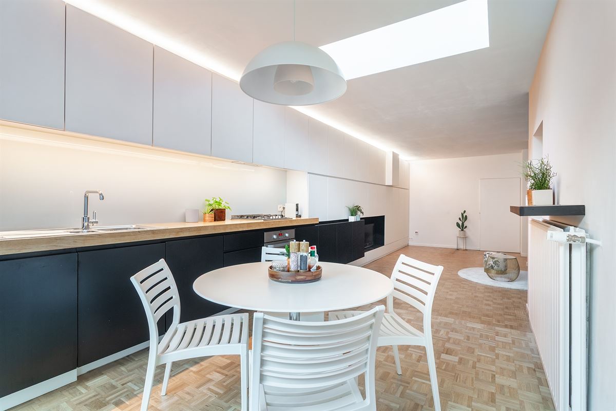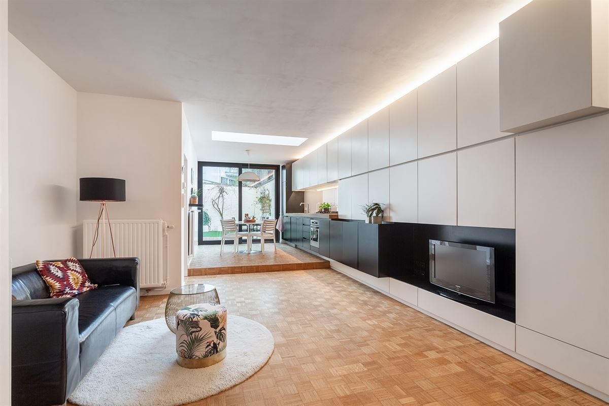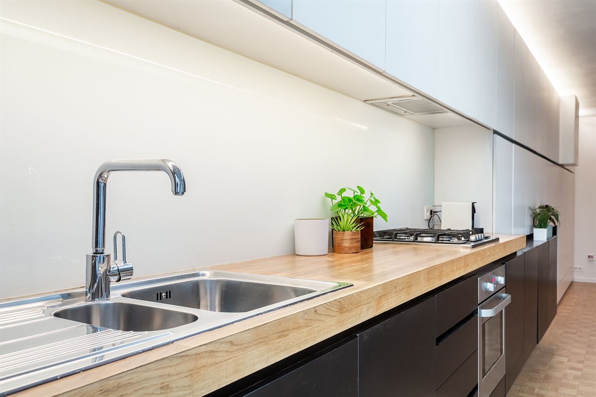 Bij het binnenkomen wordt u verwelkomd in een lichtrijke leefruimte waar maatwerk-kasten zorgen voor een strakke, harmonieuze afwerking en maximaal ruimtegebruik. De open keuken is volledig uitgerust met ingebouwde toestellen, waaronder een vaatwasser, een nieuwe koelkast en een aparte vriezer. Daarnaast is er een vestiaire en een gastentoilet voorzien.