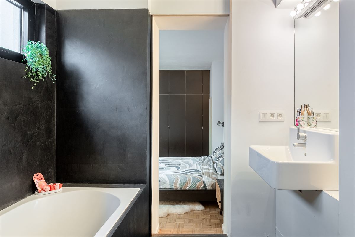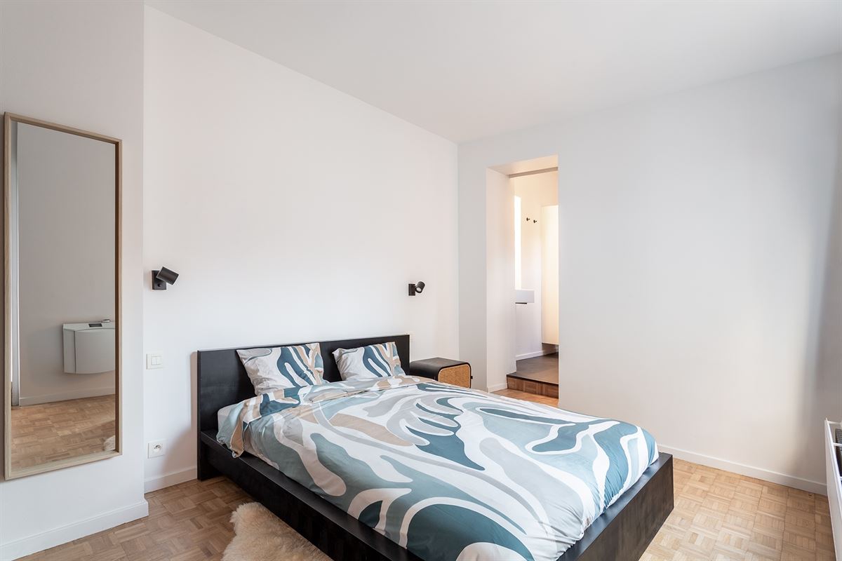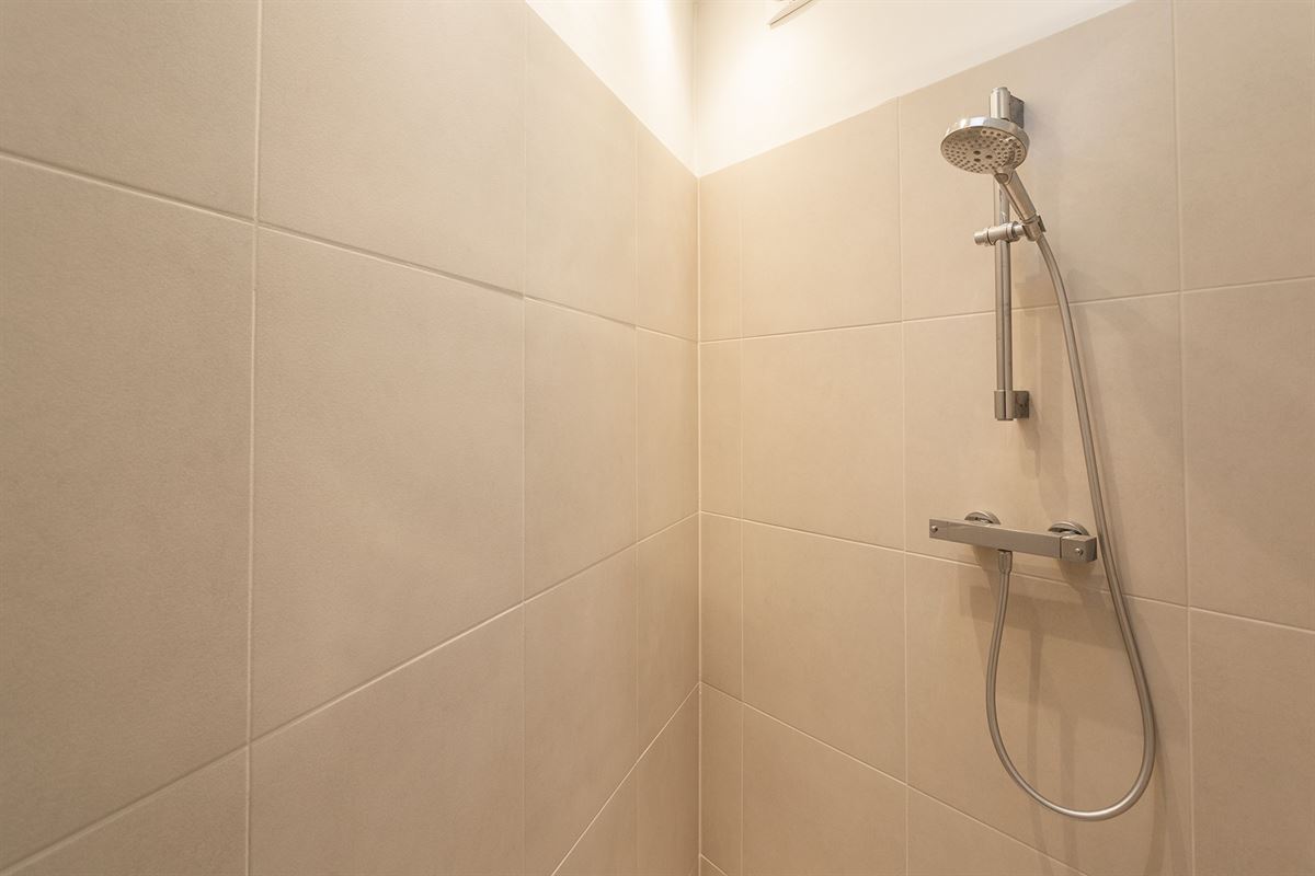 De master bedroom beschikt over ingebouwde kasten en een en-suite badkamer uitgerust met zowel een ligbad als een nieuwe inloopdouche. De tweede kamer is polyvalent en kan perfect dienstdoen als bureau, dressing of logeerkamer. In de aparte berging bevindt zich de CV-ketel en is er aansluiting voorzien voor was- en droogkast.